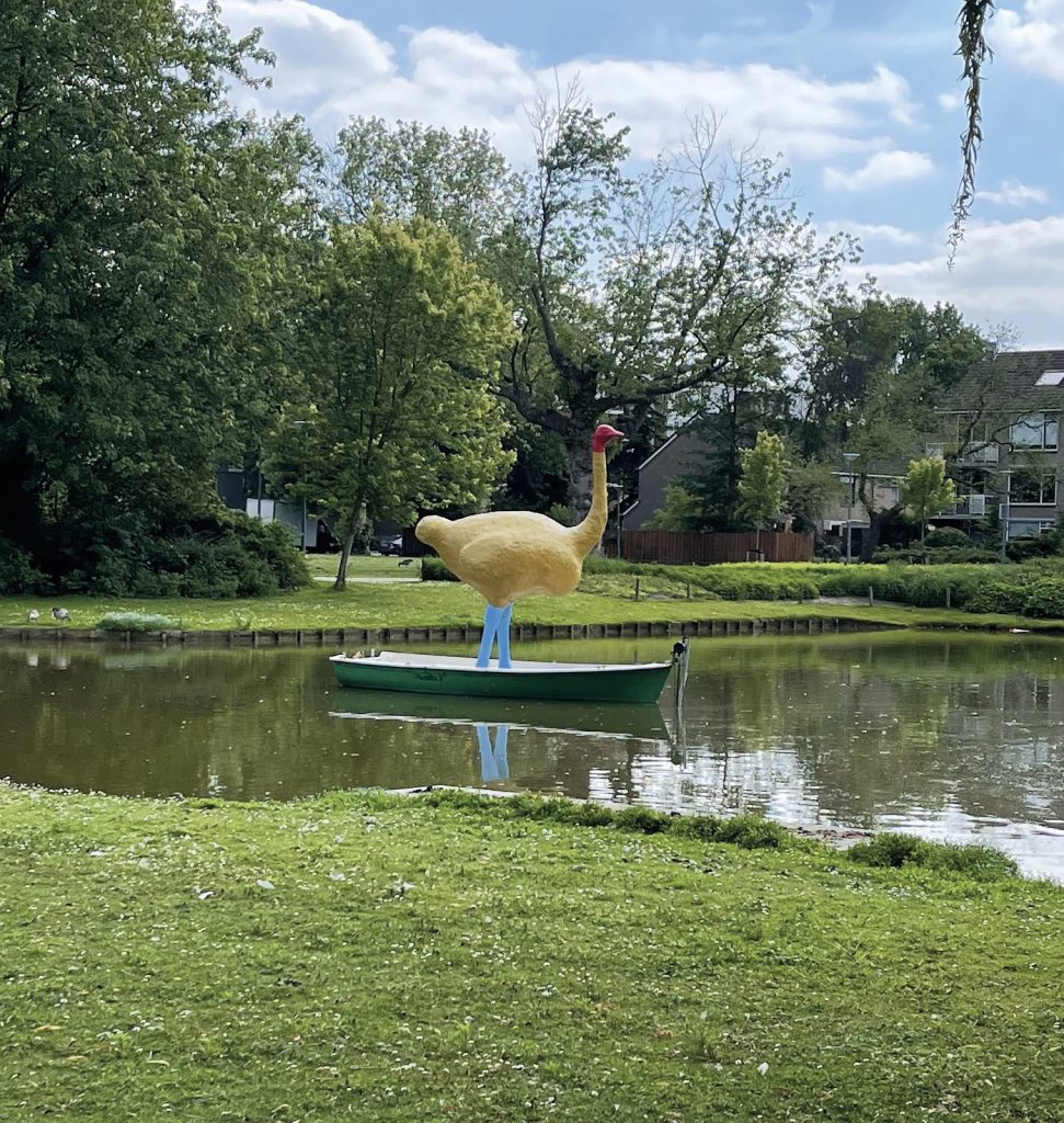 Vorig jaar werd ons door de gebiedscommissie en de cultuurscout gevraagd om, samen met een aantal andere partijen uit Schiebroek, mee te denken over kunst en cultuur in Schiebroek-Zuid. Nu was er al de wens om grote dieren naar Schiebroek te halen en dat lukte dankzij de enthousiaste medewerking en financiering door de gebiedscommissie, Cultuur Concreet en het Elise Mathilde Fonds én het Fonds voor Volkskracht. In februari werden de Dansende Beren geïnstalleerd op een vlot in de singel langs de Teldersweg en op 3 mei werd Struis te water gelaten. Beide kunstwerken zijn van de hand van Herman Lamers, een Rotterdams kunstenaar met hart voor kunst én mens. Dat zie je terug in al zijn werken. Herkenbare kunst die een glimlach op je gezicht brengt. Zo’n struisvogel in een bootje in de vijver aan de Wilgenplaslaan. Op zich een vreemde combinatie, maar kijk eens rond in Schiebroek; er zijn meer vreemde combinaties waarvan je denkt dat die niet bij elkaar horen. En toch past het en dat zorgt dan weer voor nieuwe combinaties. Het staat iedereen vrij om het mooi of lelijk te vinden. De bedoeling is dat het verrassend is en dat het bij dit deel van onze tuinstad gaat horen. Dat heeft wat tijd nodig, maar zal ongetwijfeld gebeuren.